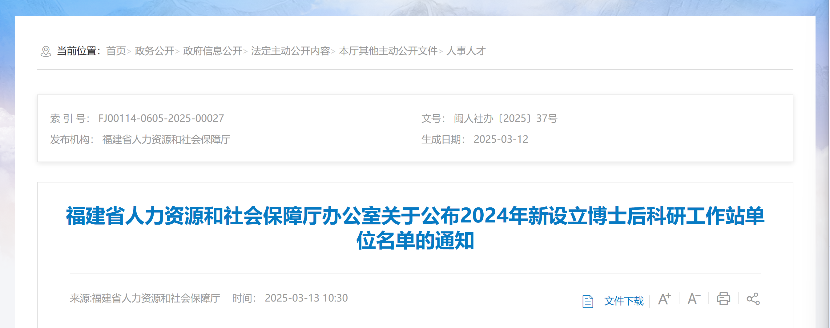 根据《全国博士后管委会办公室关于2024年度博士后科研工作站新设站备案情况的函》(博管办〔2025〕16号)通知,我省厦门市妇幼保健院等12家单位符合新设站条件,可设立博士后科研工作站,开展博士后招收培养工作(名单附后)。有关事项通知如下: