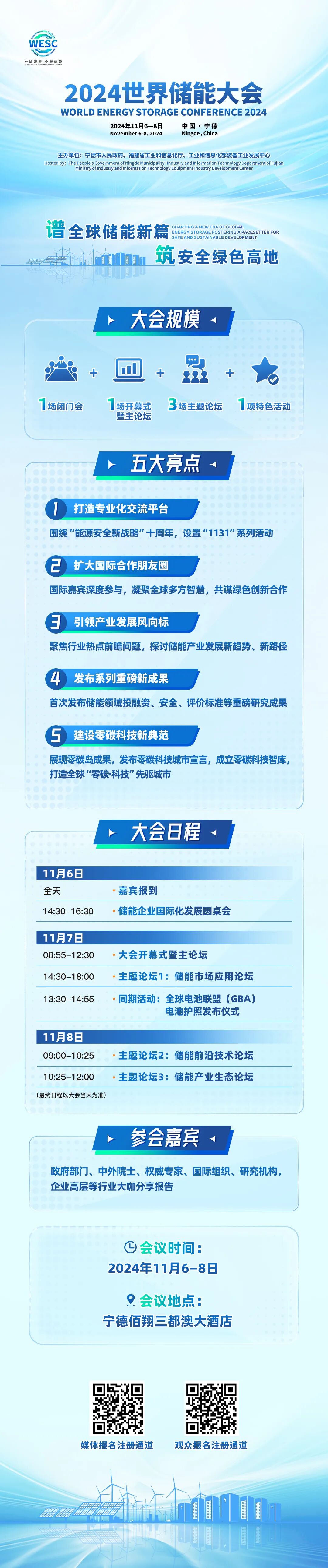 2024世界储能大会由宁德市人民政府、福建省工业和信息化厅、工业和信息化部装备工业发展中心联合举办,将于11月6—8日在福建宁德佰翔三都澳会议中心召开,大会旨在深入打造世界级储能交流合作平台,持续赋能全球储能产业协同创新和可持续发展。