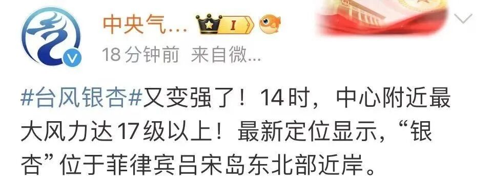 据@中央气象台消息:今年第22号台风“银杏”又变强了!14时,中心附近最大风力达17级以上,目前最大风力维持在17级(60米/秒)。最新定位显示,“银杏”位于菲律宾吕宋岛东北部近岸。