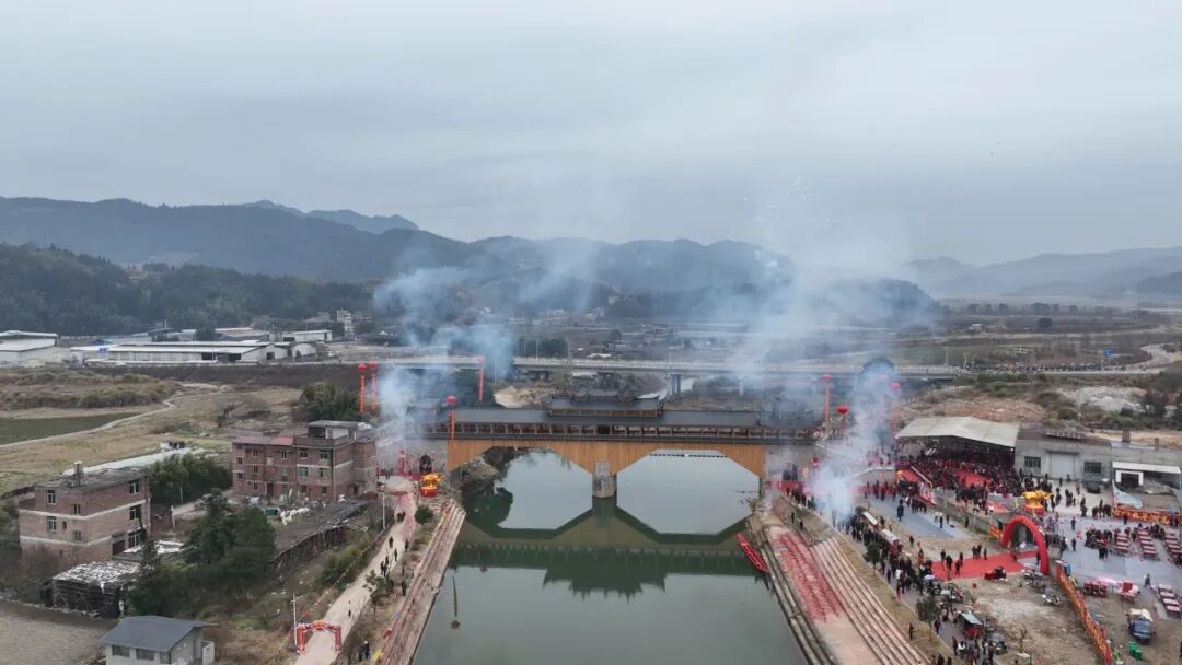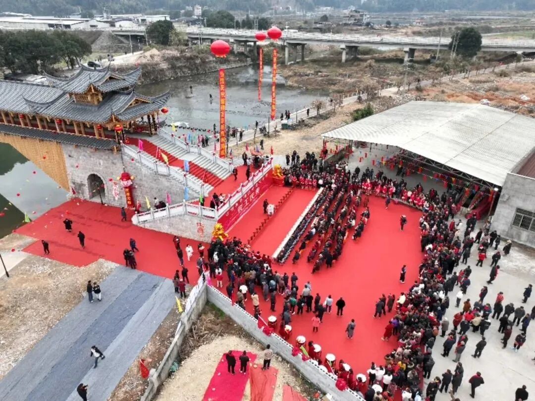 2月6日,古田县平湖镇玉源溪边热闹非凡,“共逐盛世潮 圆梦高攀桥”重建平湖高攀桥落成庆典在此举行。受邀嘉宾、乡贤及当地村民2000多人欢聚一堂,共同见证这座承载历史与希望的廊桥以崭新的姿态重现玉源溪上。